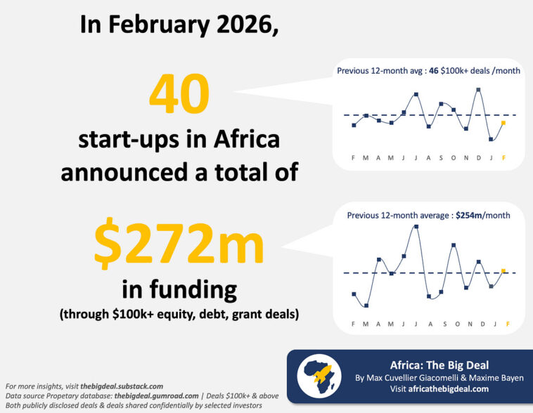 Forty startups across Africa raised more than $272 million in funding in February 2026 through deals worth at least $100,000, according to data from Africa: The Big Deal.